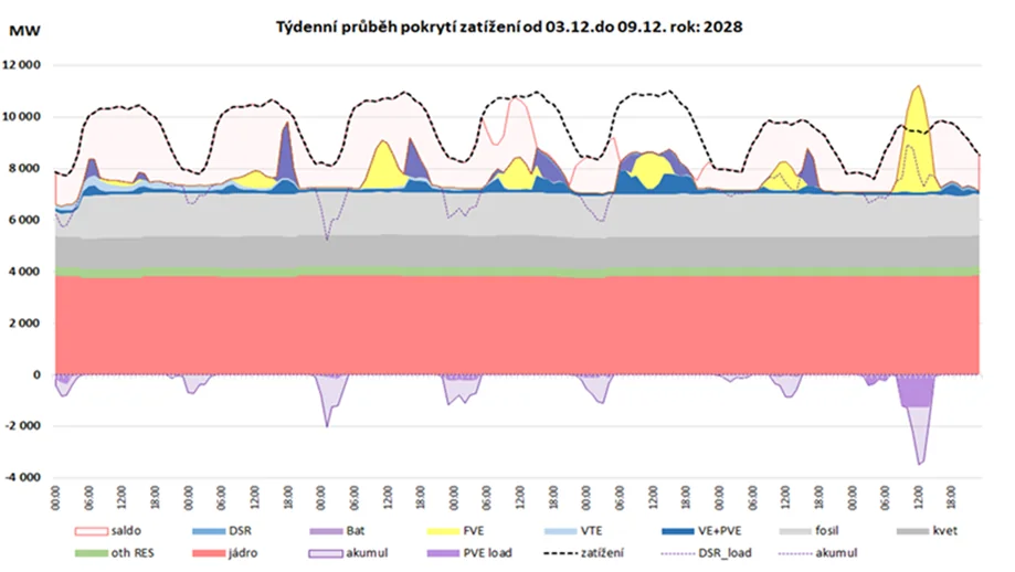 Obrázek 2 Modelový příklad zimního nedostatku elektřiny, převzato z časopisu Energetika, ročník 2025, článek Ing. Karla Vinklera.