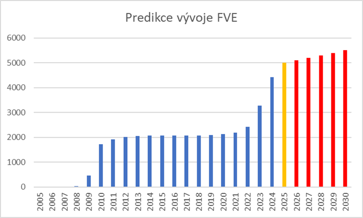 Obrázek 8 Predikce vývoje fotovoltaiky do roku 2030 při současném návrhu akceleračních zón. Zdroj: archiv autora, zpracováno ve spolupráci s Laboratoří diagnostiky fotovoltaických systémů (LDFS) FEL ČVUT, zdroj dat do roku 2024 je ERÚ / OTE / MPO, rok 2025 kvalifikovaný odhad ERÚ, další vývoj podle algoritmu autora uvedeného v této publikaci.