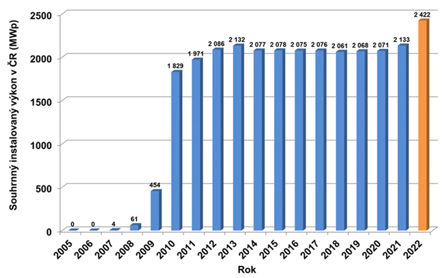 Obrázek 1: Skokový vliv dotací a nástupu „solárních baronů“ a následná desetiletá stagnace solárního oboru v domech a průmyslových parcích ČR, způsobená tehdejšími účelovými (odborně podjatými) výpočty. Některé firmy, které se tohoto účastnily, dnes pokračují v modelu SEEPIA pro Státní energetickou koncepci, kde namísto limitu 2 GW dnes naopak počítají s možnostmi až 19 GW. Naše energetická soustava se ale od té doby tak velmi nezměnila.