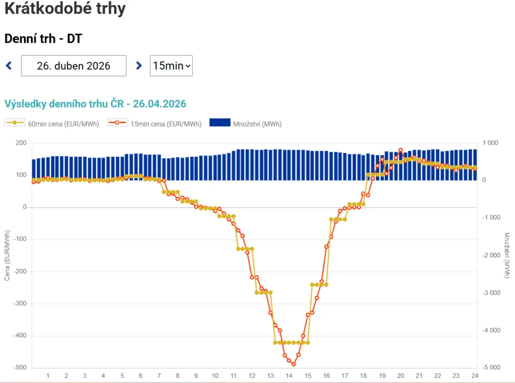 V neděli se ceny elektřiny na spotovém trhu ocitly v mínusových hodnotách zhruba od sedmé hodiny ranní do sedmnácté. Největší minimum platilo kolem 14. hodiny, kdy dosáhly ceny -500 EUR/MWh. Šlo tedy o moment, kdy byl elektřiny ten největší přebytek. V tu dobu panovalo slunečné počasí, zároveň byl kvůli víkendu malý odběr. A tak docházelo k situaci, kdy odběratelé dostávali za spotřebu elektřiny zaplaceno.