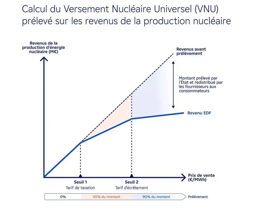 Univerzální jaderná platba (VNU – versement nucléaire universel) nahradí od 1. ledna 2026 systém ARENH a ukončí tak regulovaný přístup k jaderné elektřině na úrovni 42 EUR/MWh. VNU je založen na progresivním daňovém systému EDF: nad určitou cenu za MWh převede EDF část svých přebytečných příjmů státu (až do výše 90 % nad druhou prahovou hodnotou). Tyto příjmy mají státu umožnit automaticky snižovat ceny bez ohledu na dodávku elektřiny (tržní nebo regulovaný tarif). Pro koncové zákazníky bude tento systém podle francouzských zdrojů transparentní. Bude viditelný pouze ve formě snížení uvedeného na faktuře. Cílem je poskytnout trvalou ochranu domácností před volatilními cenami elektřiny a zároveň zajistit, aby francouzská státní společnost EDF obdržela příjmy slučitelné s náklady na jadernou výrobu, údržbu a rozvoj.